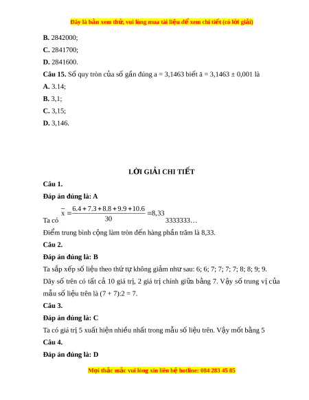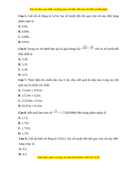 Đây là bản xem th , vu ử i lòng mua tài li u ệ đ xe ể m chi ti t (c ế ó l i ờ gi i ả ) C. 0,7; D. 2,1. Câu 10. Cho bi t ế 2 = 1,4142135.... Vi t ế g n ầ đúng số 2 theo quy t c ắ làm tròn đ n hàng ế ph n nghì ầ n, sai s t ố uy t ệ đ i ố ư c ớ lư ng đ ợ ư c ợ là A. 0,01; B. 0,002; C. 0,004; D. 0,001. Câu 11. K t ế qu l ả àm tròn s π