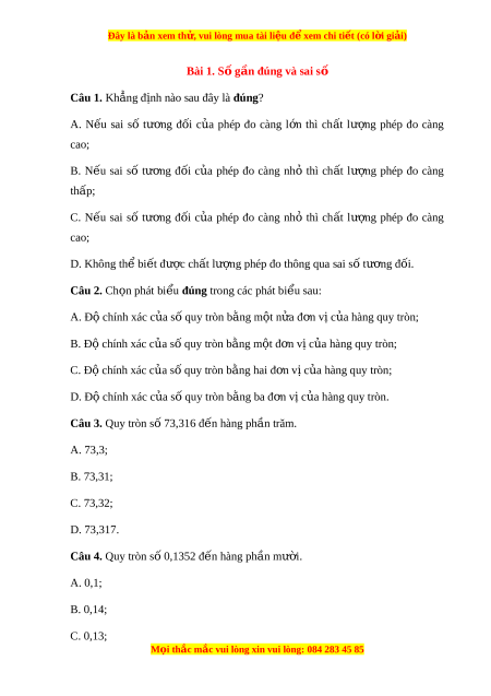 Đây là bản xem th , vu ử i lòng mua tài li u ệ đ xe ể m chi ti t ế (có l i ờ gi i ả ) Bài 1. S g ố n đúng và s ầ ai số Câu 1. Kh ng đ ẳ