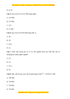 ộ chợ Trung thu có có 52 245 ngư i ờ tham d . ự H i ỏ h i ộ chợ có kho ng ả bao nhiêu nghìn ngư i ờ ? A. 52; B. 53; C. 52,2; D. 50. Câu 8. Hãy vi t ế số quy tròn c a ủ s g ố n đúng b bi ầ t ế b = 729 816 ± 500. A. 700 000; B. 729 000; C. 730 000; D. 720 000. M i ọ thắc m c