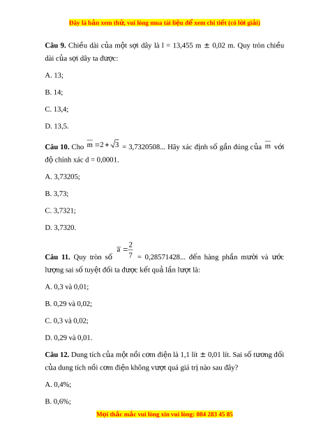Câu 11. Quy tròn số 7 = 0,28571428... đ n ế hàng ph n ầ mư i ờ và ư c ớ lư ng s ợ ai số tuy t ệ đối ta đư c ợ k t ế qu l ả n l ầ ư t ợ là: A. 0,3 và 0,01; B. 0,29 và 0,02; C. 0,3 và 0,02; D. 0,29 và 0,01. Câu 12. Dung tích c a ủ m t ộ n i ồ c m ơ đi n