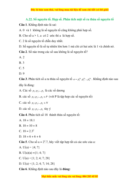 A.22. Số nguyên tố. Hợp số. Phân tích một số ra thừa số nguyên tố