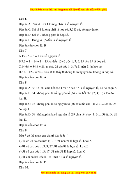 Câu 8. Thay dấu * để được số nguyên tố 3* : A. 7 B. 4 C. 6 D. 9