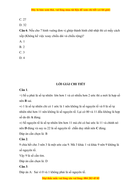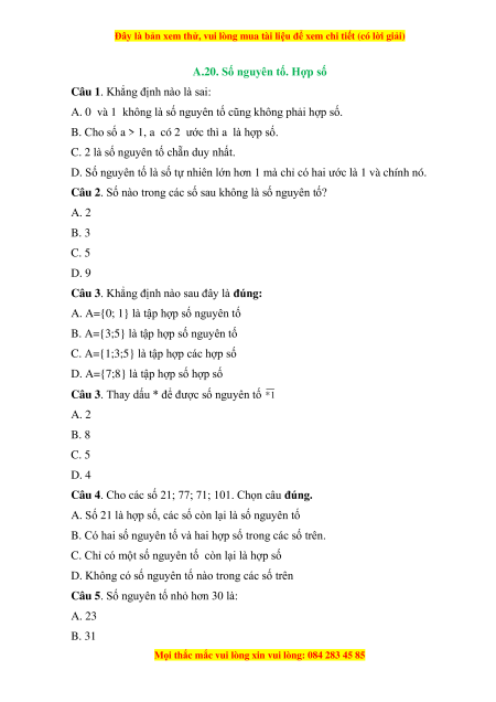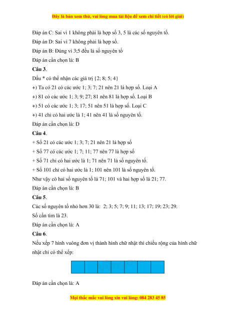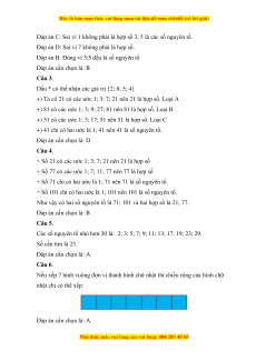 Như vậy có hai số nguyên tố là 71; 101 và hai hợp số là 21; 77. Đáp án cần chọn là: B Câu 5.