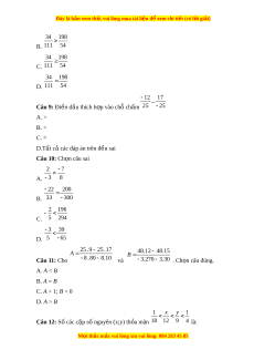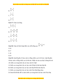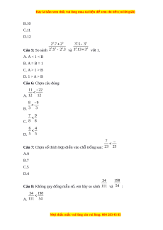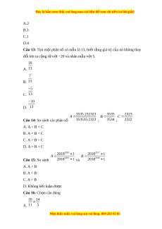 Câu 14: So sánh các phân số 353535.2323 ; 3534 ; 2322 A. A < B < C B. A = B < C C. A > B > C D. A = B = C 2018 2018 1 2017 2018 1 A B Câu 15: So sánh 2019 2018 1 và 2018 2018 1 A. A < B B. A = B C. A > B D. Không k t ế lu n đ ậ ược Câu 16: Ch n ọ câu đúng 10 14 A. 11 5 M i