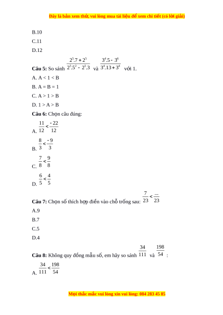 Đây là bản xem th , vu ử i lòng mua tài li u ệ đ xe ể m chi ti t ế (có l i ờ gi i ả ) B.10 C.11 D.12 5 5 2 .7 2 4 6 3 .5 3 Câu 5: So sánh 5 2 5 2 .5 2 .3 và 4 4 3 .13 3 v i ớ 1. A. A < 1 < B B. A = B = 1 C. A > 1 > B D. 1 > A > B Câu 6: Ch n ọ câu đúng: 11 22 A. 12 12 8 9 B. 3 3 7 9 C. 8 8 6 4 D. 5 5 7 ... Câu 7: Ch n ọ số thích h p đi ợ n vào ề ch t ỗ r ng s ố au: 23 23 A.9 B.7 C.5 D.4 34 198