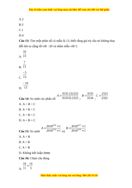 Đây là bản xem th , vu ử i lòng mua tài li u ệ đ xe ể m chi ti t ế (có l i ờ gi i ả ) A.2 B.3 C.1 D.4 Câu 13: Tìm m t ộ phân s có m ố u l ẫ à 13, bi t ế r ng gi ằ á trị c a ủ nó không thay đổi khi ta c ng ộ t v ử i ớ −20 và nhân mẫu v i ớ 5. 10 A. 13 7 B. 13 5 C. 13 10 D. 13 3535.232323 3535 2323 A B C