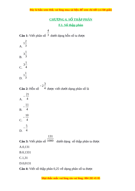Đây là bản xem th , vu ử i lòng mua tài li u ệ đ xe ể m chi ti t ế (có l i ờ gi i ả ) CHƯ N Ơ G 6. S Ố THẬP PHÂN F .1. S ố thập phân 4 Câu 1: Vi t ế phân số 3 dư i ớ d ng ạ h n s ỗ ố ta đư c ợ 2 1 A. 3 1 3 B. 3 1 3 C. 4 1 1 D. 3 3 2 Câu 2: Hỗn số 4 đư c vi ợ t ế dư i ớ d ng phân s ạ ố là 21 A. 4 11 B. 4 10 C. 4 5 D. 4 131 Câu 3: Vi t ế phân số 1000 dư i ớ d ng ạ số th p phân ậ ta đư c ợ A.0,131 B.0,1331 C.1,31 D.0,0131 Câu 4: Vi t ế số th p ậ phân 0,25 v d ề ng phân ạ số ta đư c ợ M i