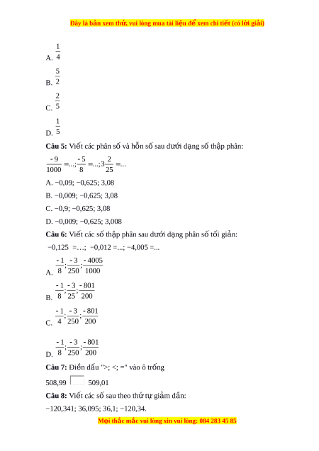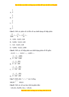 ế các phân số và hỗn số sau dư i ớ d ng s ạ ố th p ậ phân: 9 5 2 .. .; . ..;3 .. . 1000 8 25 A. −0,09; −0,625; 3,08 B. −0,009; −0,625; 3,08 C. −0,9; −0,625; 3,08 D. −0,009; −0,625; 3,008 Câu 6: Vi t ế các số th p phân s ậ au dư i ớ d ng ạ phân s t ố i ố gi n: ả