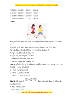 D. 36,100 > 36,095 > −120,34 > −120,341 Câu 9: Trong m t ộ cu c ộ thi ch y 200 m ạ , có ba v n ậ đ ng vi ộ ên đ t ạ thành tích cao nh t ấ là: Mai Anh: 31,42 giây; Ng c M ọ ai: 31,48 giây; Phư ng ơ Hà: 31,09 giây. Các v n đ ậ ng vi ộ ên đã v N ề h t ấ , về Nhì, v B ề a l n l ầ ư t ợ là: A.Ng c M ọ ai, Mai Anh, Phư ng H ơ à. B.Ng c ọ Mai, Phư ng ơ Hà, Mai Anh. C.Phư ng ơ Hà, Mai Anh, Ng c M ọ ai. D.Mai Anh, Ng c M ọ ai, Phư ng H ơ à.
