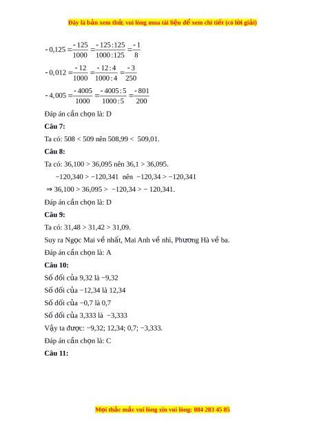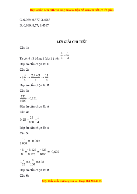 Đây là bản xem th , vu ử i lòng mua tài li u ệ đ xe ể m chi ti t ế (có l i ờ gi i ả ) C. 0,069; 0,877; 3,4567 D. 0,069; 8,77; 3,4567 L I Ờ GIẢI CHI TI T Ế Câu 1: 4 1 1 Ta có: 4 : 3 b ng ằ 1 (dư 1 ) nên 3 3 Đáp án cần ch n ọ là: D Câu 2: 3 2.4 3 11 2 4 4 4 Đáp án cần ch n ọ là: B Câu 3: 131 0 ,131 1000 Đáp án cần ch n ọ là: A Câu 4: 25 1 0,25 100 4 Đáp án cần ch n ọ là: A Câu 5: 9 0,009 1 000 5 5.125 625 0,625 8 8.125 1000 2 8 3 3 3 ,08 25 100 Đáp án cần ch n ọ là: B Câu 6: M i