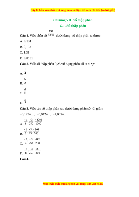 Đây là bản xem th , vu ử i lòng mua tài li u ệ đ xe ể m chi ti t ế (có l i ờ gi i ả ) Chư ng ơ VII. S t ố h p phân ậ G.1. S t ố hập phân 131 Câu 1. Vi t ế phân số 1000 dư i ớ d ng ạ số th p phân ậ ta đư c ợ A. 0,131 B. 0,1331 C. 1,31 D. 0,0131 Câu 2. Vi t ế số th p ậ phân 0,25 v d ề ng phân ạ số ta đư c ợ 1 A. 4 5 B. 2 2 C. 5 1 D. 5 Câu 3. Vi t ế các số th p phân s ậ au dư i ớ d ng ạ phân s t ố i ố gi n: ả