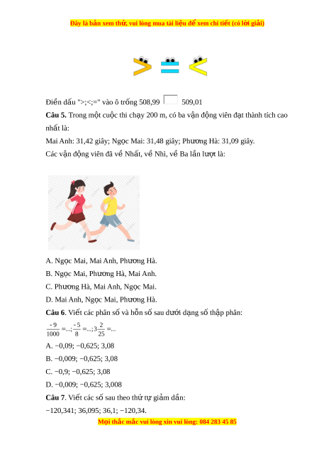 ấu ">;<;=" vào ô tr ng 508,99 ố 509,01 Câu 5. Trong m t ộ cu c ộ thi ch y 200 m ạ , có ba v n ậ đ ng vi ộ ên đ t ạ thành tích cao nh t ấ là: Mai Anh: 31,42 giây; Ng c M ọ ai: 31,48 giây; Phư ng ơ Hà: 31,09 giây. Các v n đ ậ ng vi ộ ên đã v N ề h t ấ , về Nhì, v B ề a l n l ầ ư t ợ là: A. Ng c M ọ ai, Mai Anh, Phư ng H ơ à. B. Ng c ọ Mai, Phư ng ơ Hà, Mai Anh. C. Phư ng ơ Hà, Mai Anh, Ng c M ọ ai. D. Mai Anh, Ng c M ọ ai, Phư ng H ơ à. Câu 6. Vi t