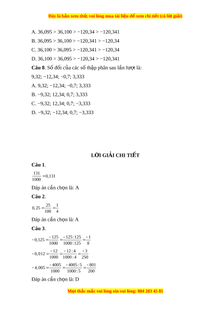 D. −9,32; −12,34; 0,7; −3,333 L I Ờ GIẢI CHI TI T Ế Câu 1. 131 0 ,131 1000 Đáp án cần ch n ọ là: A Câu 2. 25 1 0, 25 100 4 Đáp án cần ch n ọ là: A Câu 3. 125 125 :125 1 0,125 1000 1000 :125 8 12 12 : 4 3 0, 012 1000 1000 : 4 250 4005 4005 : 5 801 4, 005 1000 1000 : 5 200 Đáp án cần ch n ọ là: D M i
