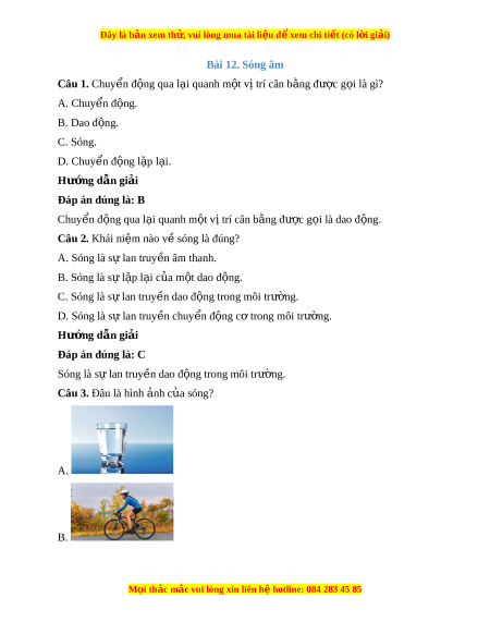 Đây là bản xem th , vu ử i lòng mua tài li u ệ đ xe ể m chi ti t (c ế ó l i ờ gi i ả ) Bài 12. Sóng âm Câu 1. Chuy n ể đ ng qua l ộ i ạ quanh m t ộ v t ị rí cân b ng ằ đư c g ợ i ọ là gì? A. Chuy n ể đ ng. ộ B. Dao đ ng. ộ C. Sóng. D. Chuy n ể đ ng l ộ p ặ l i ạ . Hư ng d ớ ẫn gi i ả Đáp án đúng là: B Chuy n ể đ ng qua l ộ i ạ quanh m t ộ v t ị rí cân b ng ằ đư c g ợ i ọ là dao đ ng. ộ Câu 2. Khái ni m ệ nào v s ề óng là đúng?
