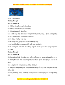 ặ nguồn âm trong môi trư ng chân ờ không. Hư ng d ớ ẫn gi i ả Đáp án đúng là: C Sóng âm có th t ể ruy n qua các ề môi trư ng ờ ch t ấ r n, ch ắ t ấ l ng, ch ỏ t ấ khí. Chân không là môi trư ng ờ không có h t ạ v t ậ ch t ấ nào khi các v t ậ phát âm dao đ ng ộ không có h t ạ v t ậ ch t ấ nào dao đ ng