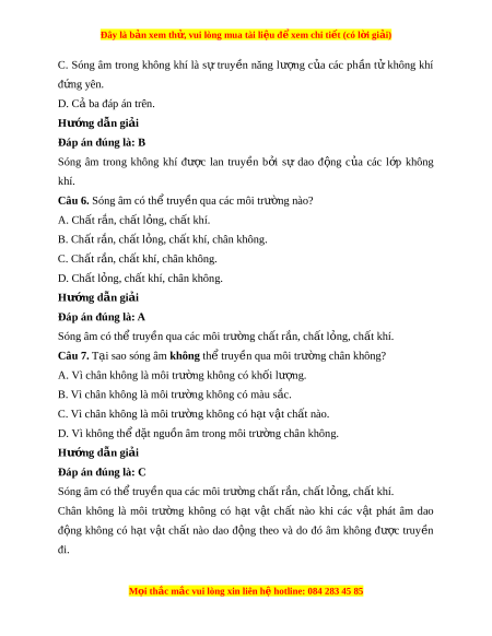 Đây là bản xem th , vu ử i lòng mua tài li u ệ đ xe ể m chi ti t (c ế ó l i ờ gi i ả ) Câu 8. Trong l p h ớ c, ọ h c s ọ inh nghe đư c l ợ i ờ gi ng ả c a t ủ h y gi ầ áo thông qua môi trư ng t ờ ruy n âm ề nào sau đây? A. Không khí. B. Ch t ấ r n. ắ C. Ch t ấ l ng. ỏ D. Chân không. Hư ng d ớ ẫn gi i ả Đáp án đúng là: A Trong l p ớ h c, ọ h c ọ sinh nghe đư c ợ l i ờ gi ng ả c a ủ th y ầ giáo thông qua môi trư ng t ờ ruy n âm ề là không khí.