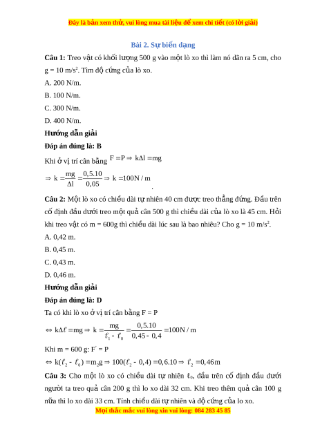 Đây là bản xem th , vu ử i lòng mua tài li u ệ đ xe ể m chi ti t ế (có l i ờ gi i ả ) Bài 2. S bi ự n d ế ng ạ Câu 1: Treo v t ậ có kh i ố lư ng ợ 500 g vào m t