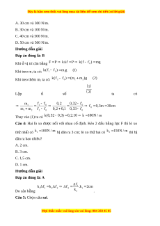 lúc sau là bao nhiêu? Cho g = 10 m/s2. A. 0,42 m. B. 0,45 m. C. 0,43 m. D. 0,46 m. Hư ng ớ d n gi ẫ i ả Đáp án đúng là: D Ta có khi lò xo v ở ị trí cân b ng ằ F = P mg 0,5.10 k m g k 100 N / m 0,45 0,4 1 0 Khi m = 600 g: F’ = P k( ) m g 100( 0,4) 0 ,6.10 0 , 46 m 2 0 2 2 2 Câu 3: Cho m t ộ lò xo có chi u
