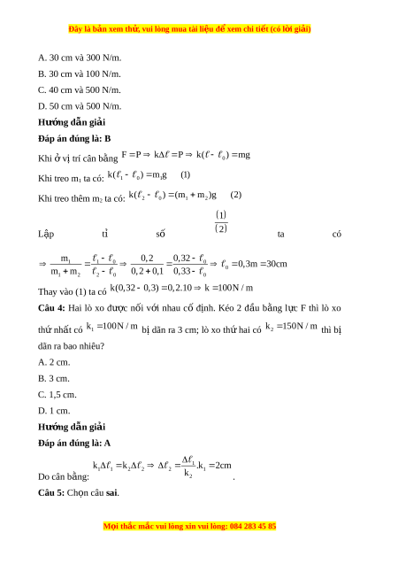 Đây là bản xem th , vu ử i lòng mua tài li u ệ đ xe ể m chi ti t (c ế ó l i ờ gi i ả ) A. 30 cm và 300 N/m. B. 30 cm và 100 N/m. C. 40 cm và 500 N/m. D. 50 cm và 500 N/m. Hư ng d ớ ẫn gi i ả Đáp án đúng là: B Khi ở v t ị rí cân b ng ằ F P k P k( ) m g 0 Khi treo m k( ) m g (1) 1 ta có: 1 0 1 Khi treo thêm m k( ) ( m m )g (2) 2 ta có: 2 0 1 2 1 L p ậ tỉ số 2 ta có m 0,2 0,32 1 1 0 0 0 ,3m 30cm 0 m m 0,2 0,1 0,33 1 2 2 0 0