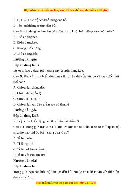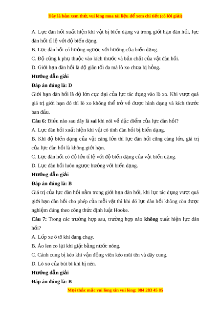 Đây là bản xem th , vu ử i lòng mua tài li u ệ đ xe ể m chi ti t ế (có l i ờ gi i ả ) A. L c ự đàn h i ồ xu t ấ hi n ệ khi v t ậ b ịbi n ế d ng ạ và trong gi i ớ h n ạ đàn h i ồ , l c ự đàn hồi tỉ lệ v i ớ đ bi ộ n d ế ng. ạ B. L c đàn h ự ồi có hư ng ng ớ ư c ợ v i ớ hư ng ớ c a bi ủ n d ế ng. ạ C. Độ c ng k ph ứ t ụ hu c vào ộ kích thư c và b ớ n ả ch t ấ c a v ủ t ậ đàn h i ồ . D. Gi i ớ h n ạ đàn h i ồ là độ giãn t i ố đa mà lò xo ch a ư b h ị ng. ỏ Hư ng ớ d n gi ẫ i ả Đáp án đúng là: D Gi i ớ h n ạ đàn h i ồ là độ l n ớ c c ự đ i ạ c a ủ l c ự tác d ng ụ vào lò xo. Khi vư t ợ quá giá trị gi i ớ h n
