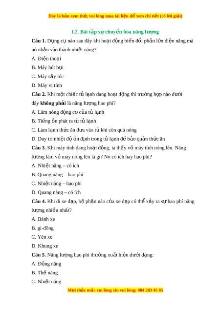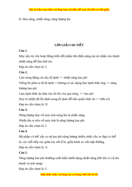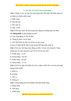 Đây là bản xem th , vu ử i lòng mua tài li u ệ đ xe ể m chi ti t ế (có l i ờ gi i ả ) I.2. Bài tập s chuy ự n hóa n ể ăng lư ng ợ Câu 1. D ng c ụ nào ụ sau đây khi ho t ạ đ ng bi ộ n đ ế i ổ ph n l ầ n ớ đi n năng m ệ à nó nh n vào t ậ hành nhi t ệ năng? A. Điện tho i ạ B. Máy hút b i ụ C. Máy sấy tóc D. Máy vi tính Câu 2. Khi m t ộ chi c t ế l ủ nh ạ đang ho t ạ đ ng ộ thì trư ng h ờ p ợ nào dư i ớ đây không ph i