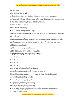 ớ đây gây lãng phí năng lư ng t ợ rong trư ng ờ h c? ọ A. Trong gi t ờ h d ể c ụ gi a ữ gi , qu ờ t ạ tr n, bóng đi ầ n t ệ rong l p v ớ n ho ẫ t ạ đ ng. ộ B. S d ử ng n ụ ước uống đ gi ể t ặ khăn lau, r a t ử ay,… C. T t ắ các thi t ế b đi ị n khi ệ ra v . ề D. Cả A và B đ u đúng. ề Câu 7. Nh ng bi ữ ện pháp dư i ớ đây: a) S d ử ng ánh n ụ ng m ắ t ặ tr i ờ để làm khô qu n áo ầ ư t ớ thay vì dùng máy s y ấ khô quần áo. b) Dùng đèn LED đ t ể h p s