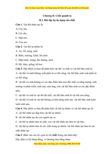 Câu 1. Vật thể nhân tạo là: A. Cây lúa. B. Cái cầu. C. Mặt trời. D. Con sóc.