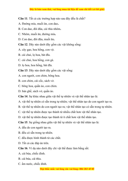 Câu 14. Sự khác nhau giữa vật thể tự nhiên và vật thể nhân tạo là: