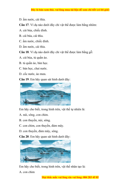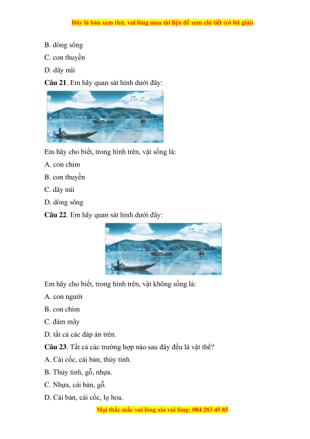 Em hãy cho biết, trong hình trên, vật thể tự nhiên là: A. núi, sông, con chim. B. con thuyền, núi, sông.
