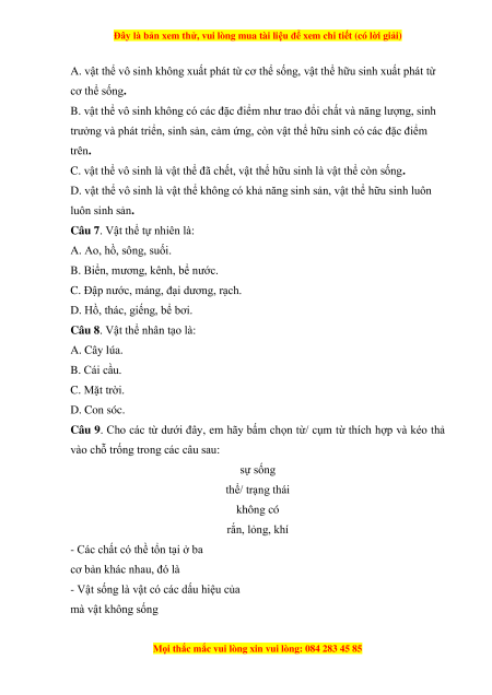 Câu 6. Đặc điểm cơ bản để phân biệt vật thể vô sinh và vật thể hữu sinh là: