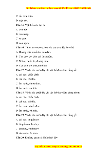 Câu 17. Ví dụ nào dưới đây chỉ vật thể được làm bằng sắt: A. cái búa, chiếc đinh. B. cái búa, cái thìa.