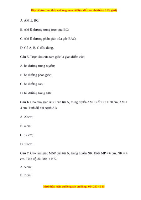 Đây là bản xem th , vu ử i lòng mua tài li u ệ đ xe ể m chi ti t ế (có l i ờ gi i ả ) A. AM ⊥ BC; B. AM là đư ng ờ trung tr c c ự a B ủ C; C. AM là đư ng ờ phân giác c a góc ủ BAC; D. Cả A, B, C đ u đúng. ề Câu 5. Tr c t ự âm c a t ủ am giác là giao đi m ể c a: ủ A. ba đư ng t ờ rung tuy n; ế B. ba đư ng ờ phân giác; C. ba đư ng ờ cao; D. ba đư ng t ờ rung tr c. ự