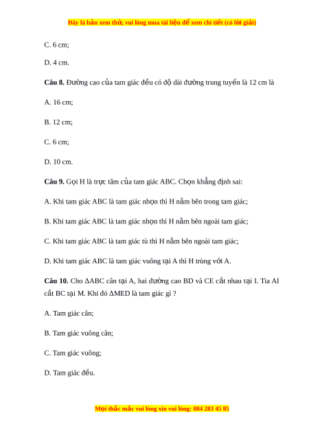 Đây là bản xem th , vu ử i lòng mua tài li u ệ đ xe ể m chi ti t ế (có l i ờ gi i ả ) C. 6 cm; D. 4 cm. Câu 8. Đư ng cao ờ c a t ủ am giác đ u ề có đ dài ộ đư ng t ờ rung tuy n l ế à 12 cm là A. 16 cm; B. 12 cm; C. 6 cm; D. 10 cm. Câu 9. G i ọ H là tr c t ự âm c a ủ tam giác ABC. Ch n ọ kh ng đ ẳ nh s ị ai: