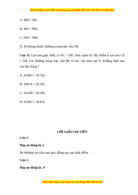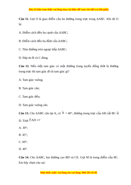 Đây là bản xem th , vu ử i lòng mua tài li u ệ đ xe ể m chi ti t ế (có l i ờ gi i ả ) Câu 11. G i ọ O là giao đi m ể c a ủ ba đư ng ờ trung tr c ự trong ΔABC. Khi đó O là: A. Đi m ể cách đ u ề ba c nh c ạ a ủ ΔABC; B. Đi m ể cách đ u ba đ ề nh c ỉ a ΔA ủ BC; C. Tâm đư ng ờ tròn ngo i ạ ti p ế ΔABC; D. Đáp án B và C đúng. Câu 12. N u ế m t ộ tam giác có m t ộ đư ng ờ trung tuy n ế đ ng ồ th i ờ là đư ng ờ trung tr c t