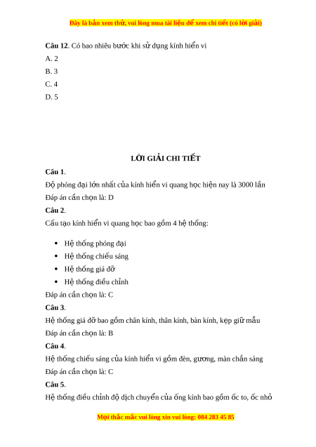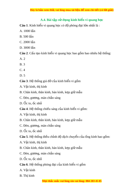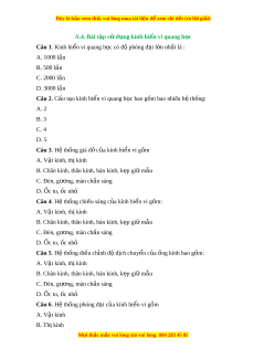 Đây là bản xem th , vu ử i lòng mua tài li u ệ đ xe ể m chi ti t ế (có l i ờ gi i ả ) A.4. Bài tập s d ử ng k ụ ính hi n vi ể quang h c ọ Câu 1. Kính hi n vi ể quang h c có ọ đ phóng đ ộ i ạ l n nh ớ t ấ là : A. 1000 lần B. 500 lần C. 2000 lần D. 3000 lần Câu 2. Cấu t o kí ạ nh hi n vi ể quang h c ọ bao g m ồ bao nhiêu h t ệ h ng: ố A. 2 B. 3 C. 4 D. 5
