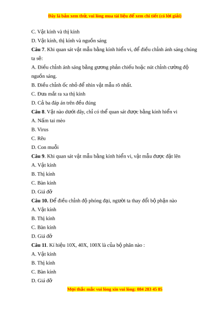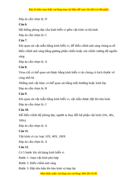 Đây là bản xem th , vu ử i lòng mua tài li u ệ đ xe ể m chi ti t ế (có l i ờ gi i ả ) Đáp án cần ch n ọ là: D Câu 6. Hệ thống phóng đ i ạ c a kí ủ nh hi n vi ể gồm v t ậ kính và th kí ị nh Đáp án cần ch n ọ là: C Câu 7. Khi quan sát v t ậ m u b ẫ ng kí ằ nh hi n vi ể , đ đi ể u ch ề nh ánh s ỉ áng chúng ta sẽ đi u ch ề ỉnh ánh sáng b ng g ằ ư ng ơ ph n chi ả u ho ế c ặ nút ch nh c ỉ ư ng đ ờ ộ nguồn sáng Đáp án cần ch n ọ là: A Câu 8. Virus chỉ có th quan ể sát đư c ợ b ng kí ằ nh hi n vi ể