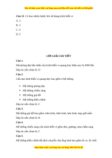 Câu 12. Có bao nhiêu bước khi sử d ng kí ụ nh hi n vi ể A. 2 B. 3 C. 4 D. 5 L I Ờ GIẢI CHI TI T Ế Câu 1. Đ phóng đ ộ i ạ l n nh ớ ất c a ủ kính hi n vi ể quang h c hi ọ n nay l ệ à 3000 l n ầ Đáp án cần ch n ọ là: D Câu 2. Cấu t o kí ạ nh hi n vi ể quang h c ọ bao g m ồ 4 h t ệ h ng: ố Hệ thống phóng đ i ạ Hệ thống chi u ế sáng Hệ thống giá đỡ Hệ thống đi u ch ề ỉnh Đáp án cần ch n ọ là: C Câu 3.