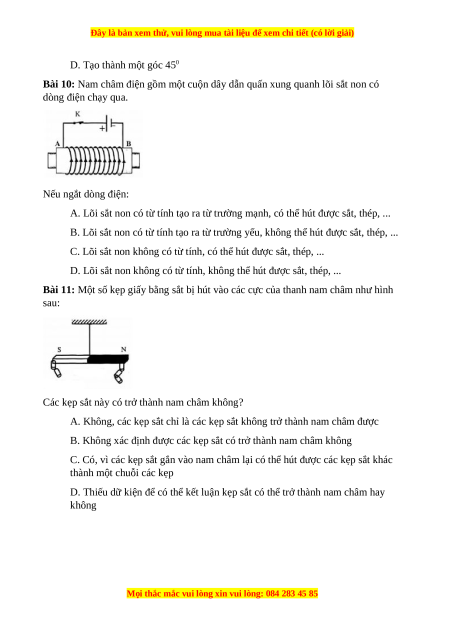 Bài 10: Nam châm điện gồm một cuộn dây dẫn quấn xung quanh lõi sắt non có dòng điện chạy qua. Nếu ngắt dòng điện: