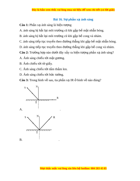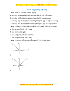 Đây là bản xem th , vu ử i lòng mua tài li u ệ đ xe ể m chi ti t (c ế ó l i ờ gi i ả ) Bài 16. S ph ự n x ả ánh s ạ áng Câu 1: Ph n ả x ánh s ạ áng là hi n t ệ ư ng ợ A. ánh sáng bị h t ắ l i ạ môi trư ng cũ khi ờ g p ặ b m ề t ặ nh n ẵ bóng. B. ánh sáng bị h t ắ l i ạ môi trư ng cũ khi ờ g p ặ b cong và nhám ề . C. ánh sáng ti p t ế c t ụ ruy n t ề heo đư ng t ờ h ng ẳ khi g p b ặ m ề t ặ nh n bóng. ẵ D. ánh sáng ti p t ế c t ụ ruy n ề theo đư ng t ờ h ng ẳ khi g p ặ b cong và nhám ề . Câu 2: Trư ng h ờ p nào d ợ ư i ớ đây x y r ả a hi n t ệ ư ng ph ợ n ả x ánh s ạ áng? A. Ánh sáng chi u t ế i ớ m t ặ gư ng. ơ B. Ánh chi u ế t i ớ t gi ờ ấy. C. Ánh sáng chi u t ế i ớ tấm th m ả len. D. Ánh sáng chi u t ế i ớ b c t ứ ư ng. ờ