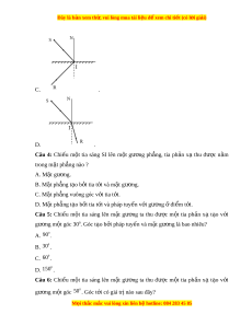 Đây là bản xem th , vu ử i lòng mua tài li u ệ đ xe ể m chi ti t (c ế ó l i ờ gi i ả ) C. . D. . Câu 4: Chi u ế m t ộ tia sáng SI lên m t ộ gư ng ơ ph ng, ẳ tia ph n ả xạ thu đư c ợ n m ằ trong m t ặ ph ng nào ? ẳ A. M t ặ gư ng. ơ B. M t ặ ph ng ẳ t o b ạ i ở tia t i ớ và m t ặ gư ng. ơ C. M t ặ ph ng ẳ vuông góc v i ớ tia t i ớ . D. M t ặ ph ng t ẳ o ạ b i ở tia t i ớ và pháp tuy n v ế i ớ gư ng ơ đi ở m ể t i ớ . Câu 5: Chi u ế m t ộ tia sáng lên m t ặ gư ng ơ ta thu đư c ợ m t ộ tia ph n ả xạ t o ạ v i ớ gư ng m ơ t ộ góc 300. Góc t o b ạ i ở pháp tuy n và m ế t ặ gư ng ơ là bao nhiêu? A. 0 90 . B. 0 30 . C. 0 60 . D. 0 150 . Câu 6: Chi u ế m t ộ tia sáng lên m t ặ gư ng ơ ta thu đư c ợ m t ộ tia ph n ả xạ t o ạ v i ớ gư ng m ơ t ộ góc 0 50 . Góc t i