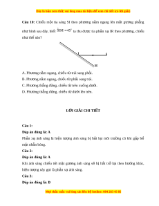 Đây là bản xem th , vu ử i lòng mua tài li u ệ đ xe ể m chi ti t (c ế ó l i ờ gi i ả ) Câu 10: Chi u ế m t ộ tia sáng SI theo phư ng ơ n m ằ ngang lên m t ộ gư ng ơ ph ng ẳ như hình sau đây, bi t ế 0 SIM 4 5 ta thu đư c ợ tia ph n ả xạ IR theo phư ng, ơ chi u ề nh t ư h nào? ế A. Phư ng n ơ m ằ ngang, chi u t ề t ừ rái sang ph i ả . B. Phư ng n ơ m ằ ngang, chi u t ề ph ừ i ả sang trái. C. Phư ng t ơ h ng ẳ đ ng, chi ứ u t ề t ừ rên xu ng d ố ư i ớ . D. Phư ng t ơ h ng ẳ đ ng, chi ứ u t ề d ừ ư i ớ lên trên. LỜI GIẢI CHI TI T Ế Câu 1: Đáp án đúng là: A Ph n ả xạ ánh sáng là hi n ệ tư ng ợ ánh sáng bị h t ắ l i ạ môi trư ng ờ cũ khi g p ặ bề m t ặ nh n ẵ bóng. Câu 2: Đáp án đúng là: A Khi ánh sáng chi u ế t i ớ m t ặ gư ng ơ ánh sáng sẽ bị h t ắ trở l i ạ theo hư ng ớ khác, hiện tư ng này g ợ i ọ là ph n ả x ánh s ạ áng. Câu 3: Đáp án đúng là: B M i