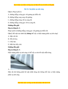 Đây là bản xem th , vu ử i lòng mua tài li u ệ đ xe ể m chi ti t (c ế ó l i ờ gi i ả ) Bài 16. S ph ự n x ả ánh s ạ áng Câu 1. Pháp tuy n l ế à A. đư ng ờ th ng vuông góc v ẳ i ớ gư ng t ơ i ạ đi m ể t i ớ . B. đư ng t ờ h ng ẳ song song v i ớ gư ng. ơ C. đư ng t ờ h ng ẳ trùng v i ớ tia sáng t i ớ . D. đư ng ờ th ng vuông góc v ẳ i ớ tia sáng t i ớ . Hư ng d ớ ẫn gi i ả Đáp án đúng là: A Pháp tuy n l ế à đư ng ờ th ng vuông góc v ẳ i ớ gư ng t ơ i ạ đi m ể t i ớ . Câu 2. Bề m t ặ nào dư i ớ đây không th x ể y ả ra hi n t ệ ư ng ợ ph n x ả ánh s ạ áng? A. M t ặ v i ả thô. B. N n đá hoa. ề C. Gi y b ấ ạc. D. M t ặ bàn th y ủ tinh. Hư ng d ớ ẫn gi i ả Đáp án đúng là: A Hi n t ệ ư ng ph ợ n ả x ánh ạ sáng có thể x y r ả a trên bề m t ặ nh n bóng. ẵ A – M t ặ v i ả thô không ph i ả bề m t ặ nh n