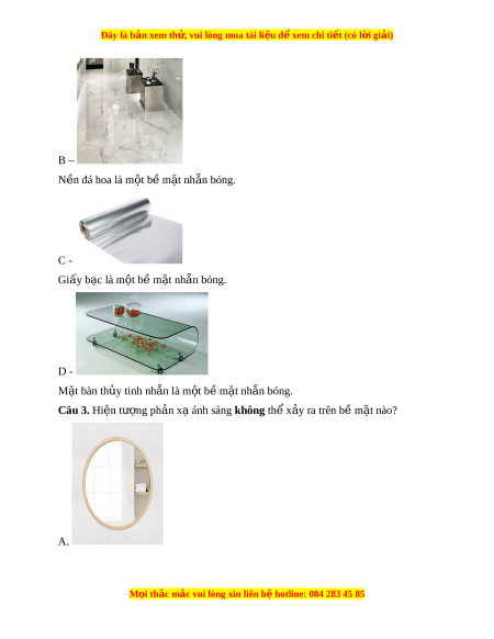 Đây là bản xem th , vu ử i lòng mua tài li u ệ đ xe ể m chi ti t (c ế ó l i ờ gi i ả ) B – N n ề đá hoa là m t ộ b m ề t ặ nh n bóng. ẵ C - Giấy b c ạ là m t ộ b m ề t ặ nh n ẵ bóng. D - M t ặ bàn th y t ủ inh nh n ẵ là m t ộ b m ề t ặ nh n ẵ bóng. Câu 3. Hi n t ệ ư ng ph ợ n ả x ánh ạ sáng không th x ể y r ả a trên b m ề t ặ nào? A. M i