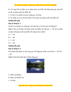 Đây là bản xem th , vu ử i lòng mua tài li u ệ đ xe ể m chi ti t (c ế ó l i ờ gi i ả ) B. Góc h p ợ b i ở tia ph n ả xạ và pháp tuy n ế t i ạ đi m ể t i ớ b ng ằ đúng góc h p ợ b i ở tia t i ớ và pháp tuy n t ế i ạ đi m ể t i ớ . C. Tia t i ớ và tia ph n ả x l ạ uôn vuông góc v i ớ nhau. D. Tia ph n x ả ạ và tia t i ớ luôn n m ằ v hai ề phía c a ủ pháp tuy n t ế i ạ đi m ể t i ớ . Hư ng d ớ ẫn gi i ả Đáp án đúng là: C Tia t i ớ và tia ph n ả x vuông góc v ạ i ớ nhau khi và ch khi ỉ góc t i ớ b ng 45 ằ 0. Câu 5. Khi tia t i ớ h p ợ v i ớ pháp tuy n ế t i ạ đi m ể t i ớ m t ộ góc i = 300 thì tia ph n ả xạ h p v ợ i ớ pháp tuy n t ế i ạ đi m ể t i ớ m t ộ góc bao nhiêu? A. i’ = 300. B. i’ = 400. C. i’ = 600. D. i’ = 450. Hư ng d ớ ẫn gi i ả Đáp án đúng là: A Theo đ nh ị lu t ậ ph n ả x ạ ánh sáng, góc t i ớ b ng ằ góc ph n ả x ạ nên khi i = 300 thì i’ = 300. Câu 6. Hình nh ả dư i ớ đây là hi n t ệ ư ng gì ợ ? A. Ph n ả x g ạ ư ng. ơ B. Ph n x ả ạ khu ch t ế án. C. In bóng. M i