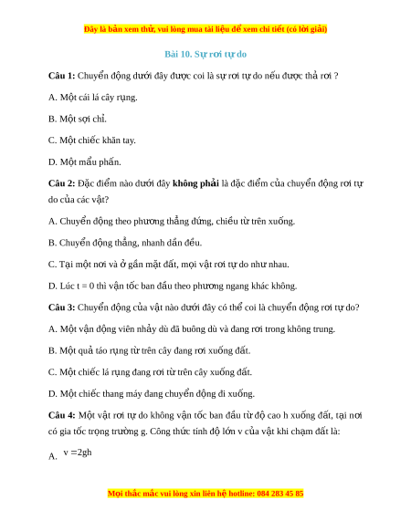 Đây là bản xem th , vu ử i lòng mua tài li u ệ đ xe ể m chi ti t (c ế ó l i ờ gi i ả ) Bài 10. Sự r i ơ t do ự Câu 1: Chuy n đ ể ng ộ dư i ớ đây đư c ợ coi là sự r i ơ t do n ự u ế đư c t ợ h r ả i ơ ? A. M t ộ cái lá cây r ng. ụ B. M t ộ s i ợ ch .ỉ C. M t ộ chi c ế khăn tay. D. M t ộ mẩu phấn. Câu 2: Đ c ặ đi m ể nào dư i ớ đây không ph i ả là đặc đi m ể c a ủ chuy n đ ể ng r ộ i ơ tự do c a ủ các v t ậ ? A. Chuy n ể đ ng t ộ heo phư ng ơ th ng đ ẳ ng, chi ứ u ề t t ừ rên xu ng. ố B. Chuy n đ ể ng ộ th ng, ẳ nhanh d n đ ầ u. ề C. T i ạ m t ộ n i ơ và g ở n m ầ t ặ đ t ấ , m i ọ v t ậ r i ơ t do nh ự nhau. ư D. Lúc t = 0 thì v n t ậ c ban đ ố u t ầ heo phư ng ngang ơ khác không. Câu 3: Chuy n đ ể ng ộ c a v ủ t ậ nào dư i ớ đây có th coi ể là chuy n đ ể ng r ộ i ơ t do? ự A. M t ộ v n ậ đ ng vi ộ ên nh y dù đã ả buông dù và đang r i ơ trong không trung. B. M t ộ quả táo r ng t ụ t ừ rên cây đang r i ơ xu ng đ ố t ấ . C. M t ộ chi c ế lá r ng đang r ụ i ơ t t ừ rên cây xu ng đ ố t ấ . D. M t ộ chi c t ế hang máy đang chuy n đ ể ng đi ộ xu ng. ố Câu 4: M t ộ v t ậ r i ơ tự do không v n ậ t c ố ban đ u ầ t ừ đ ộ cao h xu ng ố đ t ấ , t i ạ n i ơ có gia tốc tr ng t ọ rư ng g. C ờ ông th c ứ tính độ l n v c ớ a v ủ t ậ khi ch m ạ đ t ấ là: A. v 2 gh M i