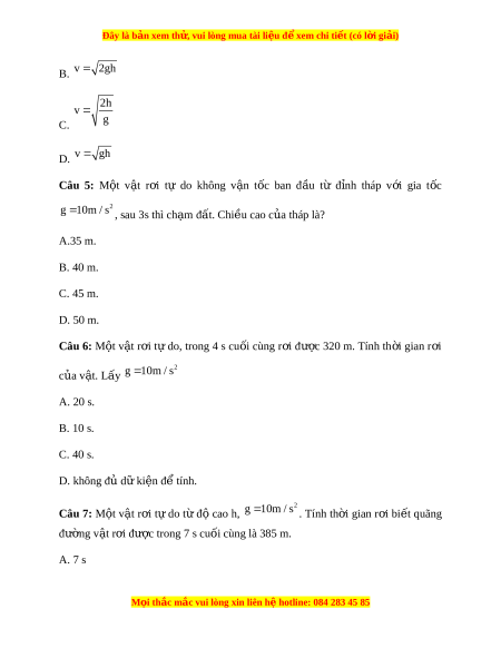 Đây là bản xem th , vu ử i lòng mua tài li u ệ đ xe ể m chi ti t (c ế ó l i ờ gi i ả ) B. v 2gh 2h v C. g D. v gh Câu 5: M t ộ v t ậ r i ơ tự do không v n ậ t c ố ban đ u ầ từ đ nh ỉ tháp v i ớ gia t c ố 2 g 1 0m / s , sau 3s thì ch m ạ đ t ấ . Chi u cao c ề a ủ tháp là? A.35 m. B. 40 m. C. 45 m. D. 50 m. Câu 6: M t ộ v t ậ r i ơ t ự do, trong 4 s cu i ố cùng r i ơ đư c ợ 320 m. Tính th i ờ gian r i ơ 2 c a ủ v t ậ . L y ấ g 1 0m / s A. 20 s. B. 10 s. C. 40 s. D. không đủ d ki ữ ện để tính. 2 Câu 7: M t ộ v t ậ r i