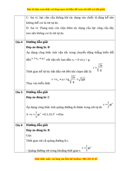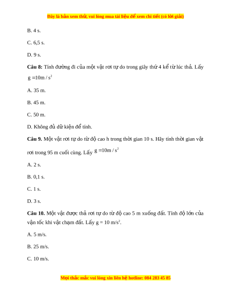 Đây là bản xem th , vu ử i lòng mua tài li u ệ đ xe ể m chi ti t (c ế ó l i ờ gi i ả ) B. 4 s. C. 6,5 s. D. 9 s. Câu 8: Tính đư ng ờ đi c a ủ m t ộ v t ậ r i ơ t ự do trong giây th ứ 4 k ể t ừ lúc th . ả L y ấ 2 g 1 0m / s A. 35 m. B. 45 m. C. 50 m. D. Không đủ d ki ữ ện đ t ể ính. Câu 9. M t ộ v t ậ r i