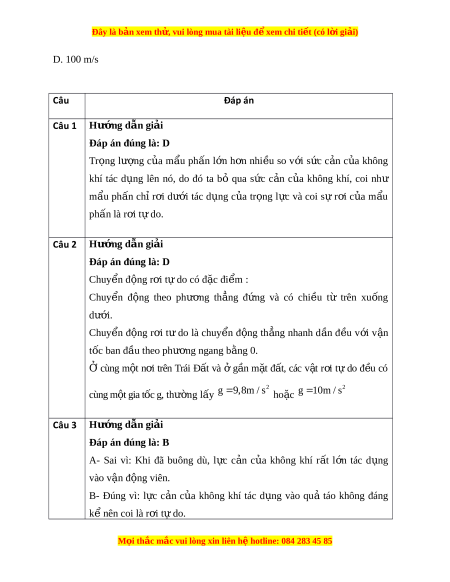 Đây là bản xem th , vu ử i lòng mua tài li u ệ đ xe ể m chi ti t (c ế ó l i ờ gi i ả ) D. 100 m/s Câu Đáp án Câu 1 Hư ng d ớ ẫn gi i ả