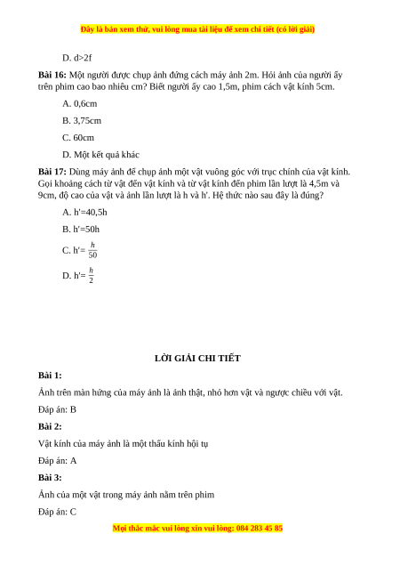 9cm, độ cao của vật và ảnh lần lượt là h và h'. Hệ thức nào sau đây là đúng? A. h′=40,5h B. h′=50h h C. h′= 50 h D. h′= 2 LỜI GIẢI CHI TIẾT Bài 1: