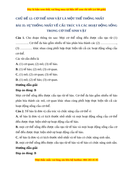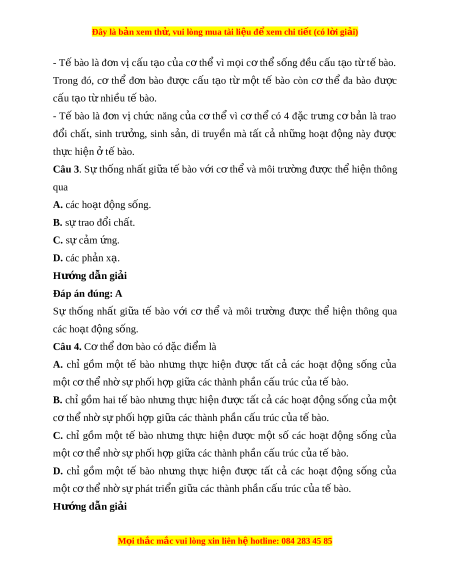 Đây là bản xem th , vu ử i lòng mua tài li u ệ đ xe ể m chi ti t (c ế ó l i ờ gi i ả ) - Tế bào là đ n ơ vị c u ấ t o ạ c a ủ c ơ th ể vì m i ọ c t ơ h s ể ng ố đ u ề c u ấ t o ạ t ừ t ế bào. Trong đó, cơ thể đ n ơ bào đư c ợ c u ấ t o ạ từ m t